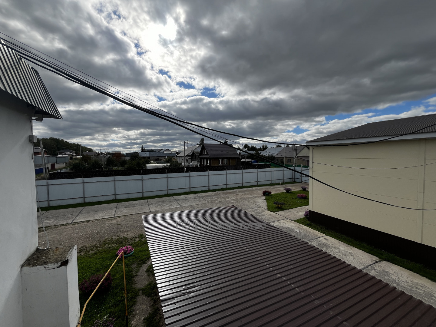 Асфальтированная территория, огорожена забором.